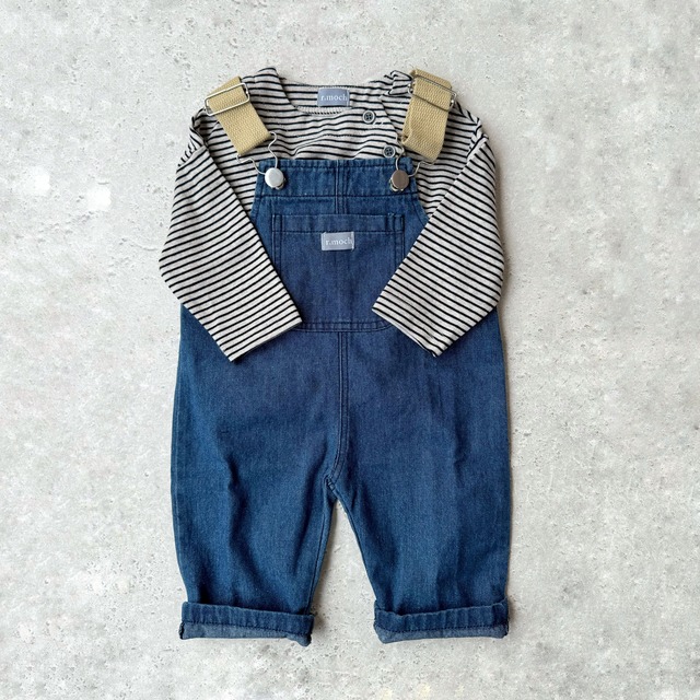 フロントポケットのデニムオーバーオールです。 ベージュのカラーテープでバイカラー仕様となっており、よりトップスと合わせやすいのがポイントです。 ハイハイ期〜よちよち歩きのお子様が屋内屋外でしっかり遊べる丈夫なお作りとなっております。 ボトルネックトップスでフリルをチラ見せしたり、付け襟やニット帽などの小物で雰囲気を変えられるのもデニムの良いところ♡ カーディガンやベストを羽織れば寒い時期も暖かく過ごせます。 -size- (75) (80) (90) 身幅 28.5 29 30 着丈 58 61 65 (肩紐アジャスターMAX時) 股下 16.5 17.5 18 平置きサイズです