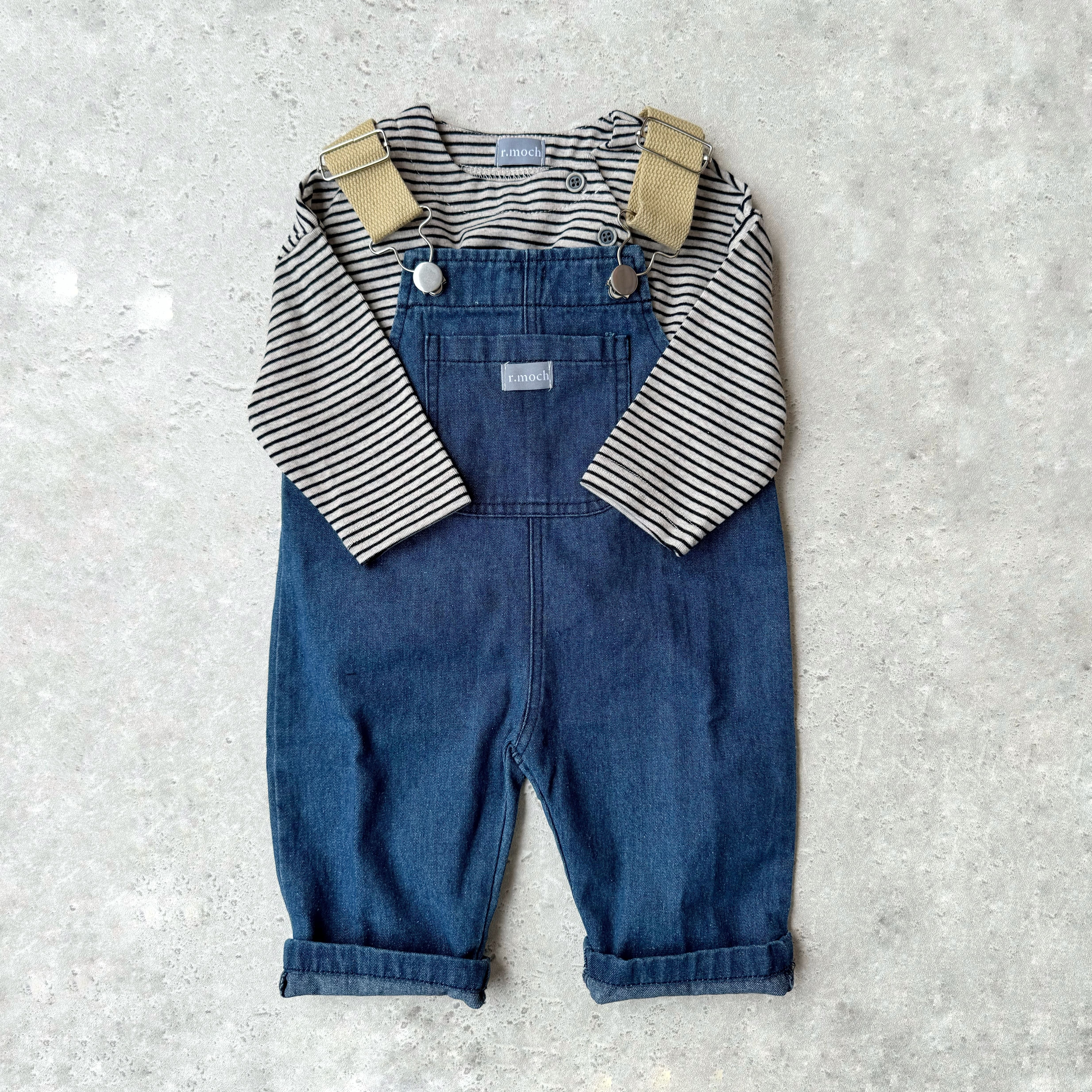 フロントポケットのデニムオーバーオールです。